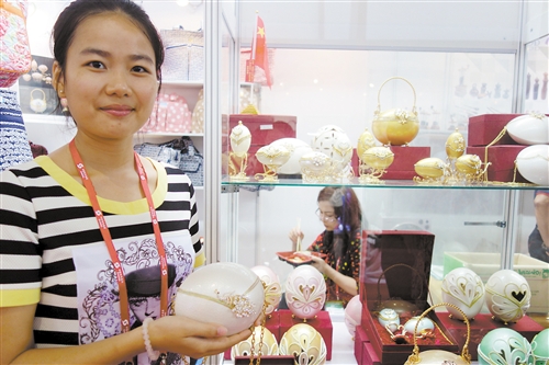 “小的是用鹅蛋壳制作的,大的则是用鸵鸟蛋壳加工而成,我们会在蛋壳上涂上特殊的材料以增加其硬度,既美观又实用。”泰国参展商介绍,泰国人十分喜爱蛋壳工艺品。工艺品一般是用来收藏贵重的首饰和作为结婚礼物赠予新人,工艺上比较华丽,还可以在蛋壳上镶嵌珠宝碎石,图案也多以象征吉祥的花草、动物为主。根据工艺的难度、材质和大小,价格在400元至1600元。