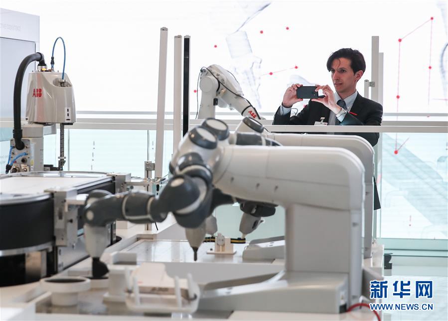 4月1日,在德国汉诺威,一名工作人员用手机拍摄ABB公司展区的机械臂。当日,2019年汉诺威工业博览会(工博会)正式开门迎客,并将持续至4月5日。本届工博会主题为“融合的工业——工业智能”,共吸引来自全球75个国家和地区的6500家参展商参展,参观人数预计将超过22万。 新华社记者单宇琦摄