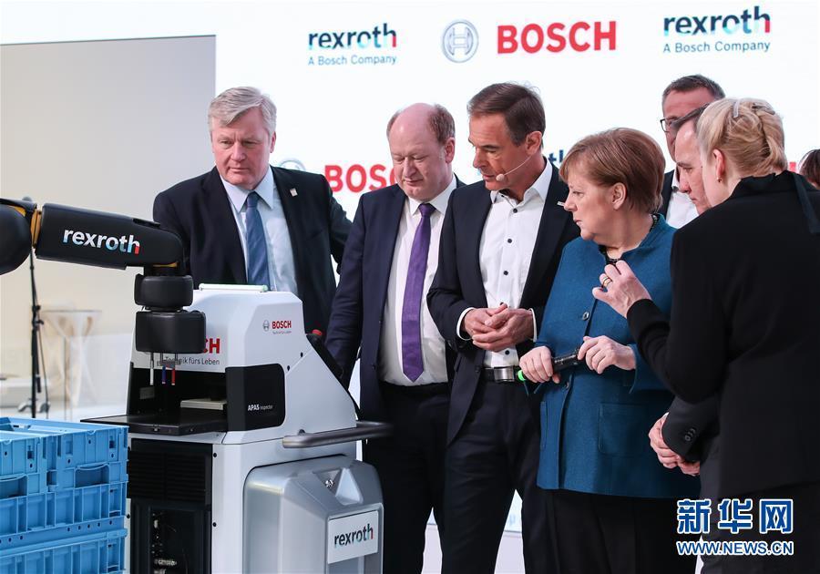 4月1日,在德国汉诺威,德国总理默克尔(左四)参观博世力士乐公司展区。当日,2019年汉诺威工业博览会(工博会)正式开门迎客,并将持续至4月5日。本届工博会主题为“融合的工业——工业智能”,共吸引来自全球75个国家和地区的6500家参展商参展,参观人数预计将超过22万。 新华社记者单宇琦摄