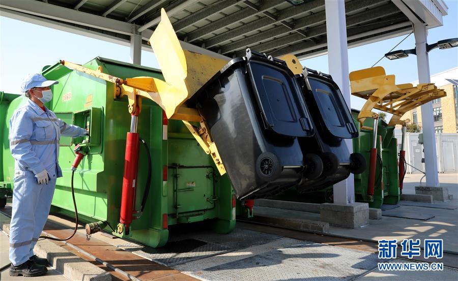 4月1日,后台保障工作人员将垃圾桶中收集的干垃圾倒入专门的垃圾压缩箱内。 新华社记者方喆摄