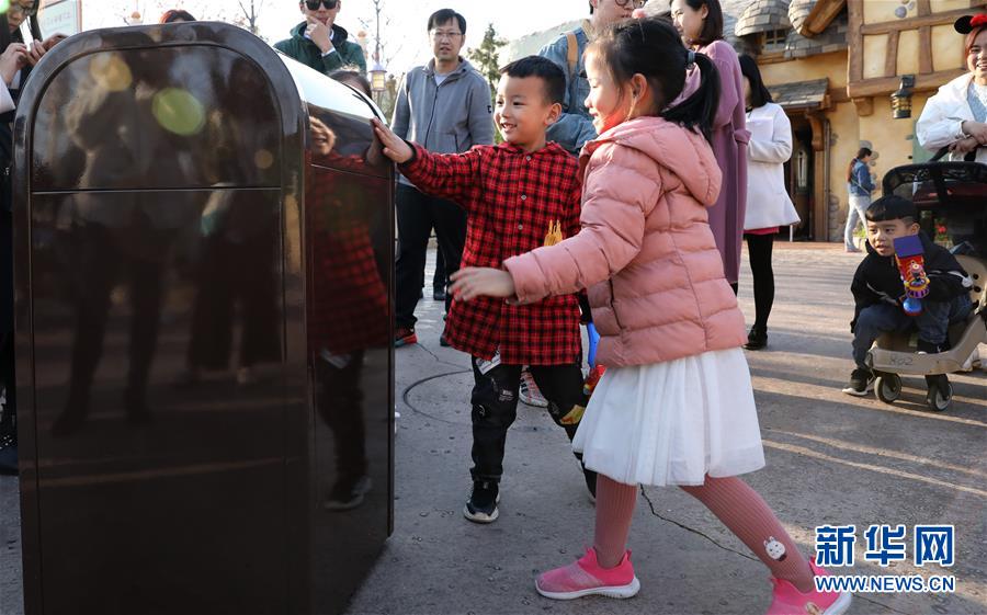 4月1日,小游客们触摸会说话的移动回收站“小推”。 新华社记者方喆摄