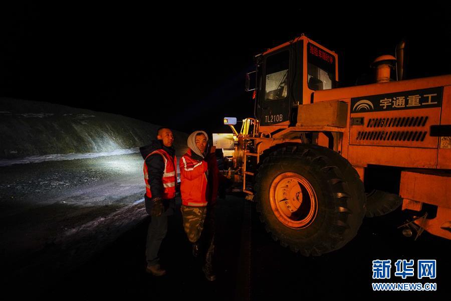 巴图散(右)和铲车司机在商量救援方案(2月28日摄)。新华社记者赵戈摄