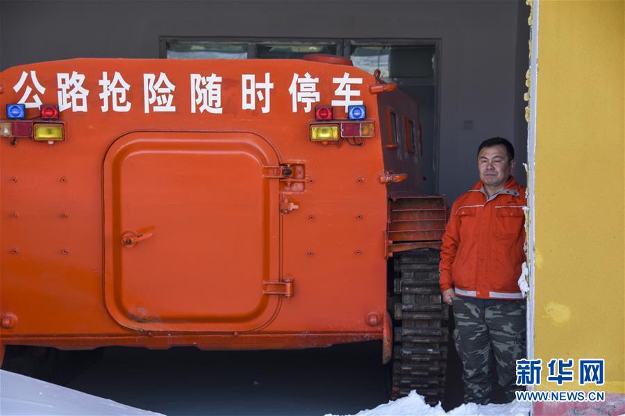 新华社记者赵戈摄 巴图散站在救援队特殊配备的一辆86式步兵战车旁注视远方(2月27日摄)。新华社记者赵戈摄 巴图散(中)调集救援队的铲车,将牵引绳挂在等待救援的卡车后部,准备将其拖出(2月28日摄)。