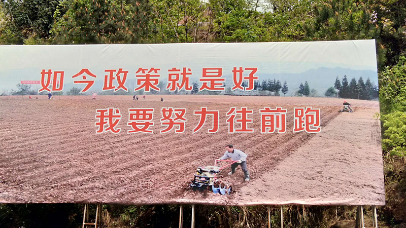 △“先吃黄连苦,后享蜂蜜甜”。在石柱县的大街小巷、田间地头经常能见到这幅标语。2018年,石柱县建档立卡贫困群众人均可支配收入达到8903元,较2014年增长1.98倍。(央视记者邓丽娟拍摄)