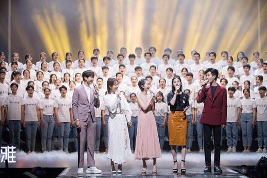 周冬雨、杨紫、张碧晨、魏大勋、于朦胧同台演唱《强国一代有我在》。湖南卫视供图