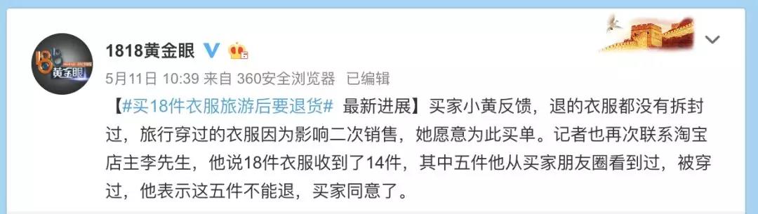 11日,买家黄小姐通过微博回应此事。黄小姐表示,用不喜欢的衣服拍了照片确实不对,她愿意真诚道歉,“道歉是因为确实不该有侥幸心理用不喜欢的衣服拍照片,但不是因为一开始想退单,因为我从来没有这样想过。”