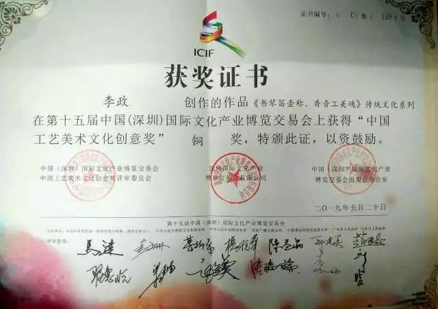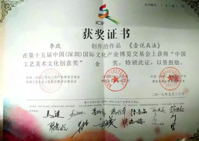 第十五届中国(深圳)国际文化产业博览交易会“中国工艺美术文化创意奖”揭晓,经过专家评审,固原秦长城文化艺术旅游产业博览中心负责人李政及其团队创作的《壶说兵法》荣获金奖、《书琴笛壶称、香音工美魂》荣获铜奖。