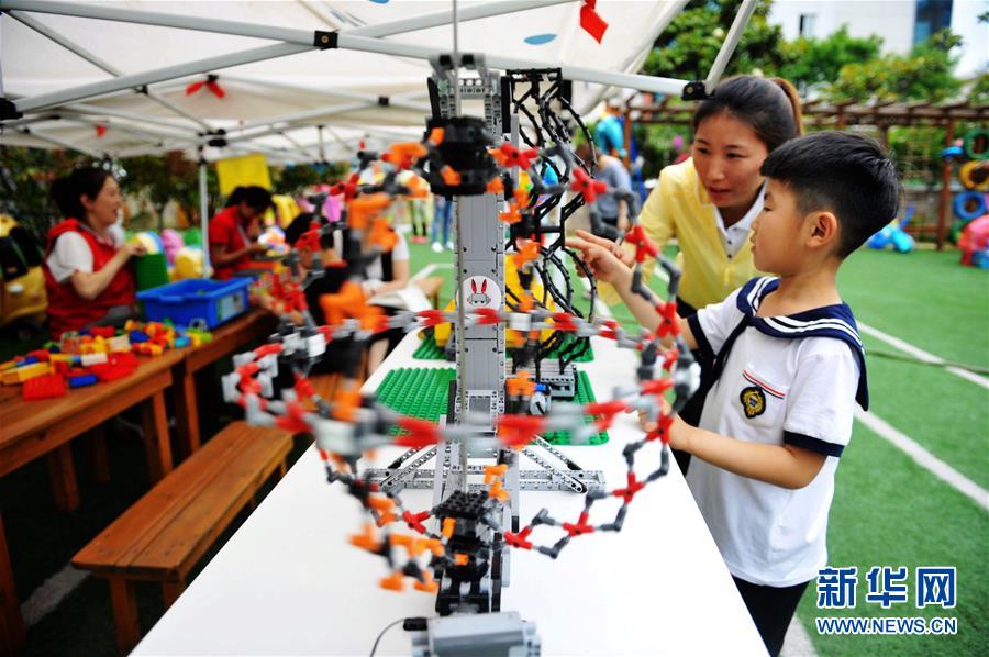 5月30日,山东青岛西海岸新区薛家岛中心幼儿园举办的迎“六一”活动中,家长与孩子一起观看模型展示。 新华社发(俞方平 摄)