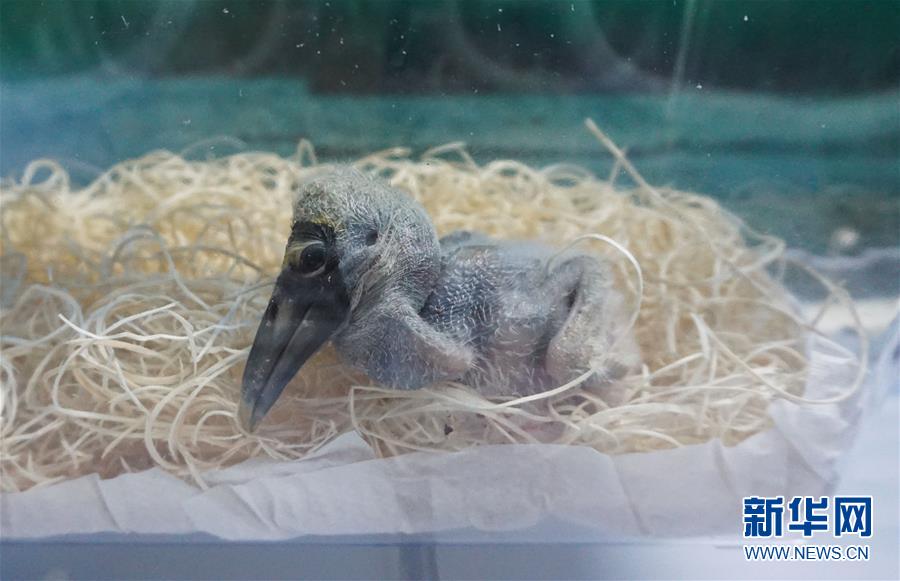 广州长隆飞鸟乐园鸟类繁育中心育婴箱里的黄嘴鹮鹳雏鸟(6月14日摄)。新华社记者 刘大伟 摄