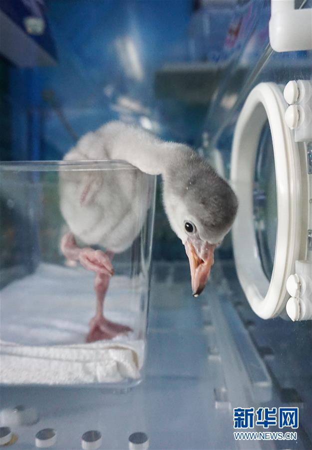 广州长隆飞鸟乐园鸟类繁育中心育婴箱里的非洲火烈鸟雏鸟(6月14日摄)。新华社记者 刘大伟 摄