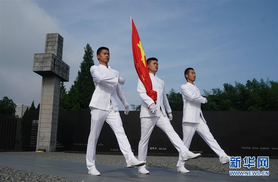 活动上举行升国旗仪式(7月7日摄)。 7月7日,位于南京的侵华日军南京大屠杀遇难同胞纪念馆举行活动纪念全民族抗战爆发82周年。 新华社记者 季春鹏 摄