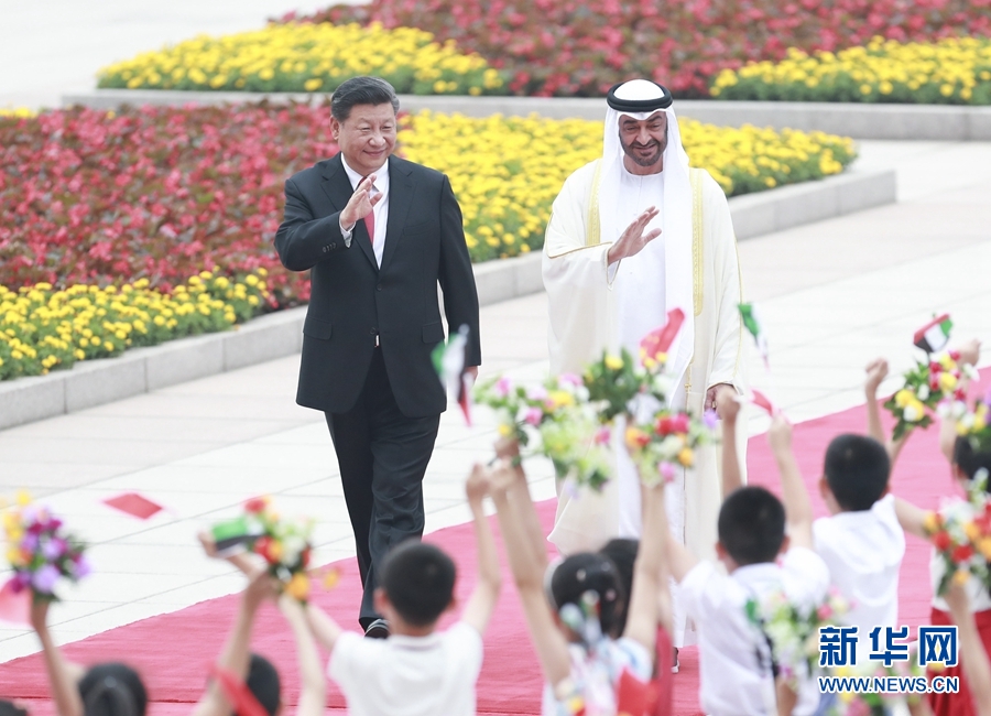 7月22日,国家主席习近平在北京人民大会堂同阿联酋阿布扎比王储穆罕默德举行会谈。这是会谈前,习近平在人民大会堂东门外广场为穆罕默德举行欢迎仪式。新华社记者 翟健岚 摄 图片来源:新华网