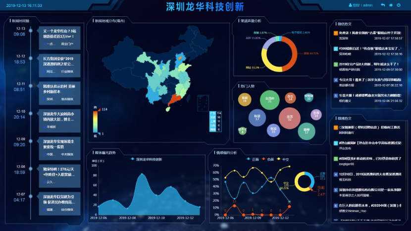 除了精准的社情民意分析,“智慧龙华互联网舆情专题”还能对突发事件进行预警和追踪,通过刻画事件在发生、发展、高峰、回落等不同发展阶段的演变态势辅助决策者作出充分应对准备。按照舆论内容、高频词汇、总量统计、情感走向、评论回帖内容、传播路径分析、影响力等信息,形成数据统计报告,并运用大数据可视化大屏,实现多维度数据直观实时展示,便于政府部门现场指挥调度。