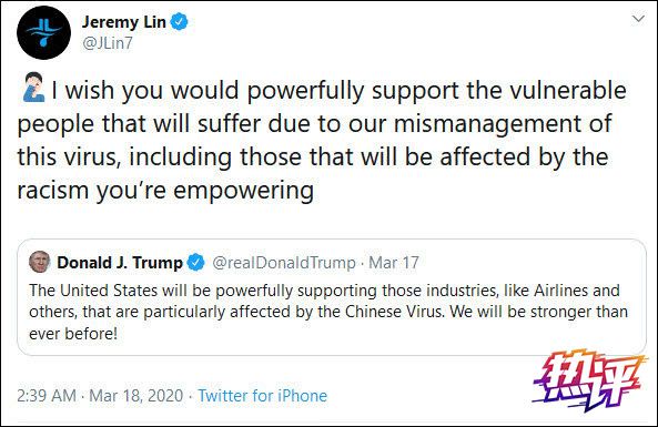 对于有网友声称,“在特朗普之前,所有主要媒体都将(新冠病毒)称作‘武汉病毒’”,林书豪回击道:“你敢说这种叫法不掺杂一丝反华情绪吗?你敢说亚裔人士在美国没有因此而受到不公待遇和人身攻击吗?把这种病毒称作‘新冠病毒’或‘2019新冠肺炎’有那么难吗?”