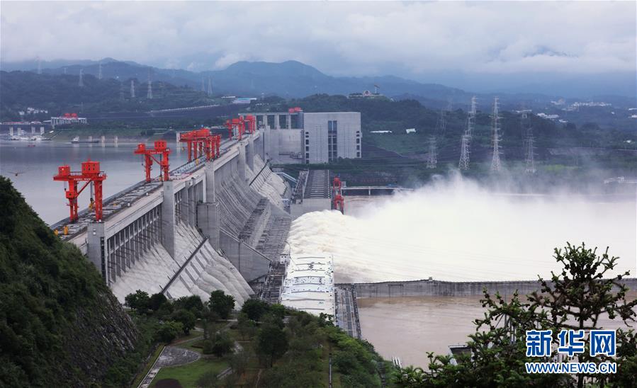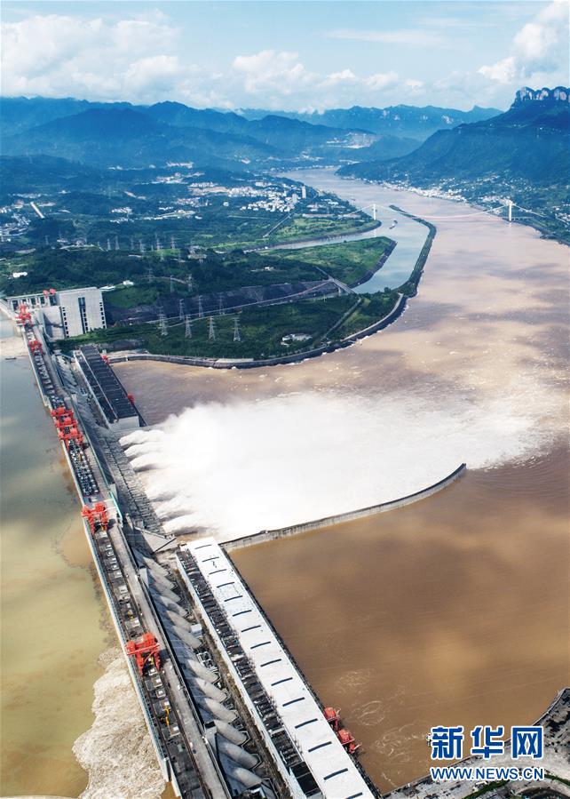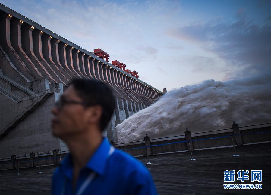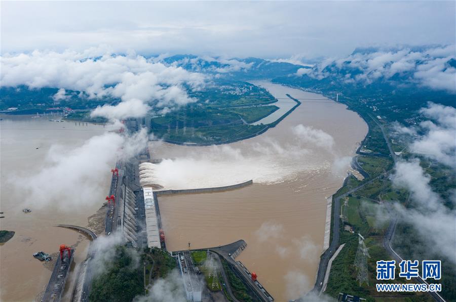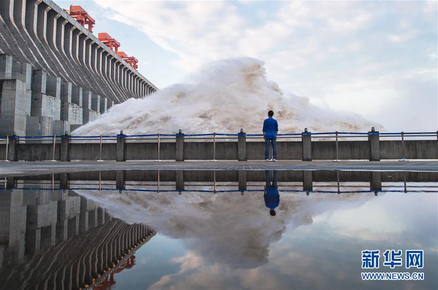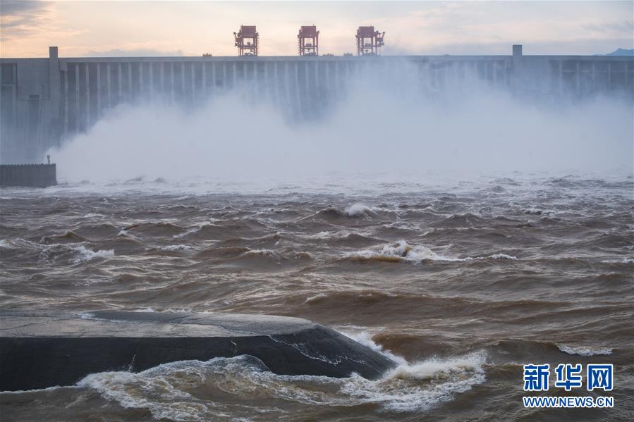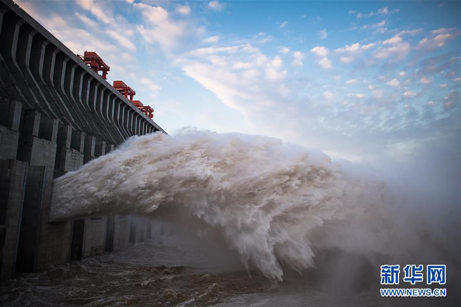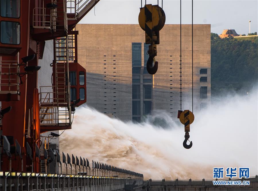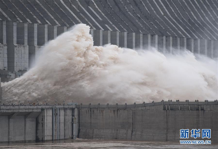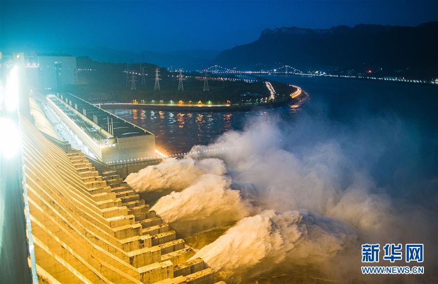 7月19日,三峡枢纽开启泄洪深孔泄洪。 19日20时,三峡水库入库流量4.6万立方米/秒,较本轮洪水的峰值6.1万立方米/秒下降了1.5万立方米/秒。“长江2020年第2号洪水”平稳通过三峡大坝。 新华社记者 肖艺九 摄