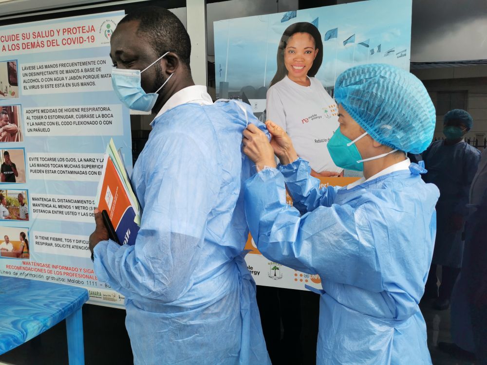 6月1日,在赤道几内亚首都马拉博一所收治新冠患者的定点医院,中国抗疫医疗专家组成员帮助当地同行整理防护服。新华社发(专家组供图)