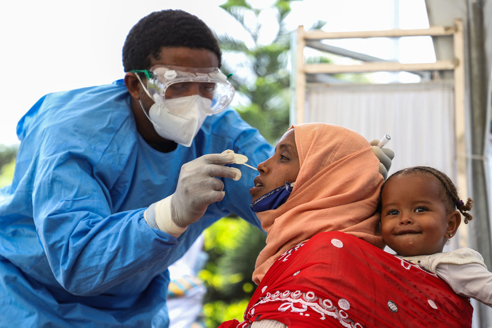8月17日,在埃塞俄比亚首都亚的斯亚贝巴附近的蒂鲁内什-北京医院,医务人员给一名女士进行新冠病毒检测采样。新华社发(迈克尔·特韦尔德摄)