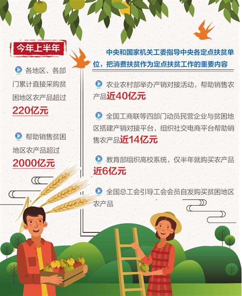 消费扶贫正在全社会形成合力。中央和国家机关工委指导中央各定点扶贫单位,把消费扶贫作为定点扶贫工作的重要内容。农业农村部举办产销对接活动,帮助销售农产品近40亿元;全国工商联等四部门动员民营企业与贫困地区搭建产销对接平台,组织社交电商平台帮助销售农产品近14亿元;教育部组织高校系统,仅半年就购买农产品近6亿元;全国总工会引导工会会员自发购买贫困地区农产品。
