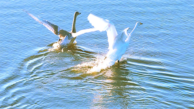 10月20日,天鹅在翁牛特旗其甘湖面上练习飞翔,准备南迁。李富摄