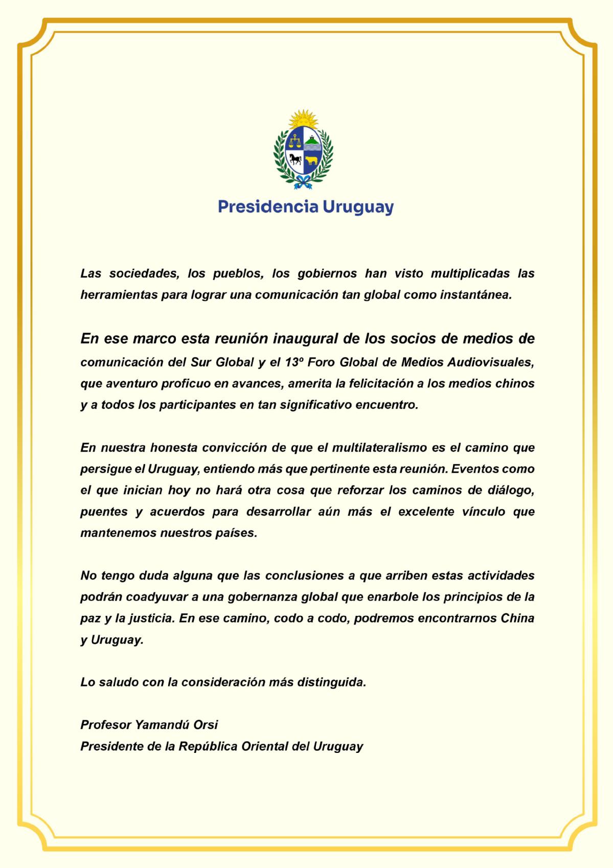 奥尔西在贺信中指出,“全球南方媒体伙伴”机制成立大会暨第十三届全球视频媒体论坛的召开意义重大、前景可期。此次盛会必将进一步促进对话交流,搭建理解与合作的桥梁,深化各国之间的紧密关系。大会所取得的成果,将有助于推动完善全球治理体系,维护国际公平正义。在这一进程中,乌拉圭将与中国携手并肩,共同前行。