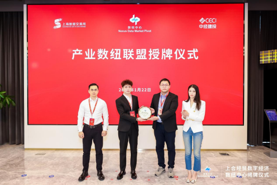 在上海数据交易所副总经理(主持工作)李晶、中国 — 上海合作组织经贸交流中心主任杨子军的见证下,上海数据交易所战略与政府事务部总经理陈钢、华铁控股(北京)有限公司总裁李强龙共同为上合经贸数字经济数纽中心揭牌。这标志着数据要素在产业升级与经贸合作场景的应用迈入全新阶段;随后,在上海数据交易所运营总监吴婕、中国—上海合作组织经贸交流中心常务副主任李靖泽的共同见证下,产业数纽联盟秘书长单位代表赵伟向华铁控股副总裁马鑫颁发产业数纽联盟授牌,这是深化数字合作的又一关键突破,将进一步凝聚产业合力,推动数据要素与实体经济深度融合,助力数字贸易合作新生态筑牢产业根基。