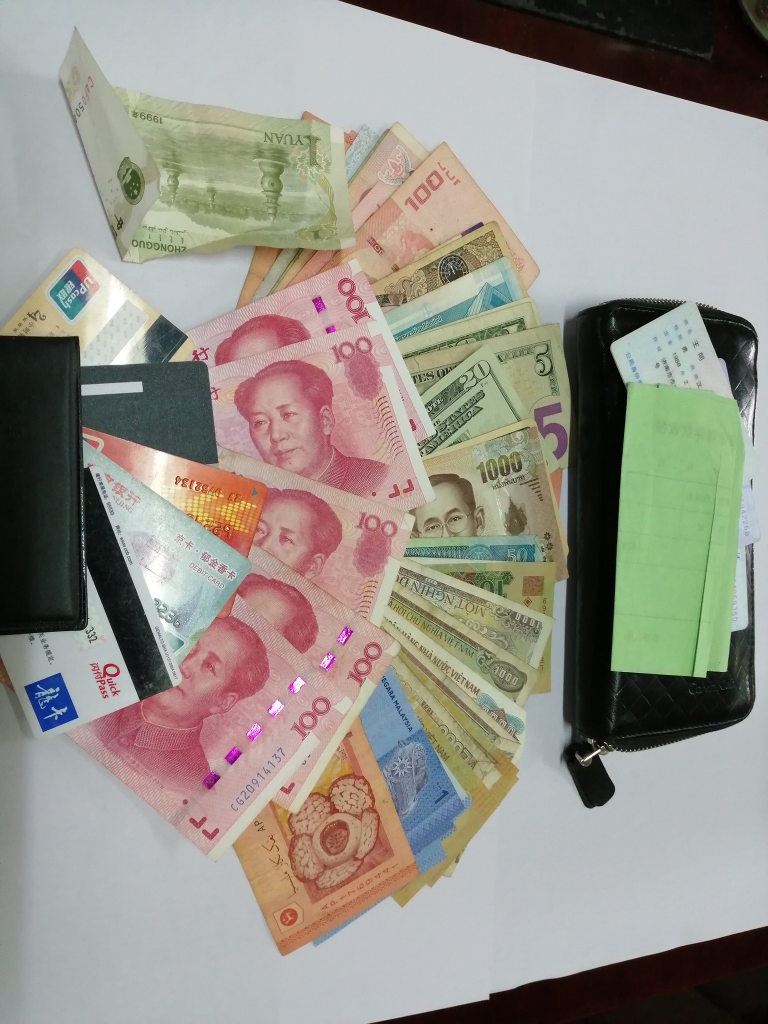 日前,K3路公交驾驶员张同在停车场清理车厢卫生时,发现后车厢座椅下面有一个黑色钱包,张师傅立即将钱包交到车队,然后和车队工作人员一起清点钱包里面的东西。钱包内有几百元人民币、外币,还有驾驶证、港澳通行证、多张银行卡、本人身份证等重要证件,证件的主人是王同。
