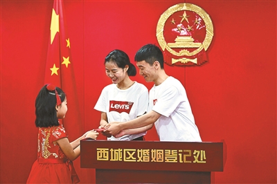 为增添喜庆气氛,弘扬传统婚俗文化,西城区婚姻登记处特意选取8名小朋友作为“小花童”,身着传统唐装,为完成新婚颁证仪式的新人们送上真挚的祝福,同时送出由婚姻登记处为新人精心准备的木制祝福许愿牌。西城区民政局婚姻登记处负责人郝嫔介绍,8位“小花童”的年龄在6岁到9岁,都是婚登处工作人员的孩子,之前进行了简单培训,昨天一早又排练了一遍。郝嫔表示,由于结婚登记的新人都很喜欢“小花童”,今后“小花童”这样的形式将一直保留下去。文/本报记者 李天际 摄影/本报记者 林辉