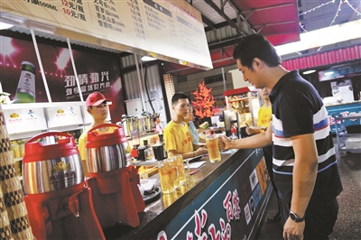 花生配毛豆、啤酒配炸鸡……8月19日傍晚,北青报记者来到位于百荣D座南广场的啤酒花园。现场摆放了百余张消夏凉亭,慕名而来的食客围坐在一起,边吃边聊。据百荣世贸商城副总经理张蔚介绍,为搭上夜间经济的消夏列车,百荣世贸商城从百余家餐饮商户中甄选十余家商户,开办啤酒花园,提供特色海鲜、精美小食、果汁饮品、酒水饮料等,现场可同时容纳500人就餐。“从第一天正式运营情况看,香辣臭鳜鱼、秘制炒年糕、炒烤肉等消夏美食非常受欢迎。”张蔚说。