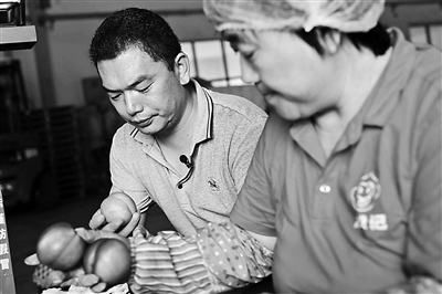 关金宝对桃农有着高标准,因流水线快速包装不能耽误,他在入库口催促桃农快送货