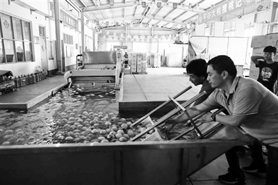 浮力上线是鲜桃自动化分拣的第一步,通过浮力也能减少果品碰撞产生的磕碰伤。此后,还要经过6道水洗消毒,才能包装上市