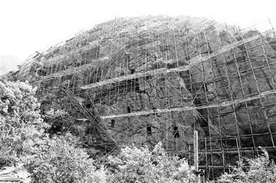 姚家营洞穴遗址位于崖壁之上,现场搭设了总高度48米、宽度130米的脚手架