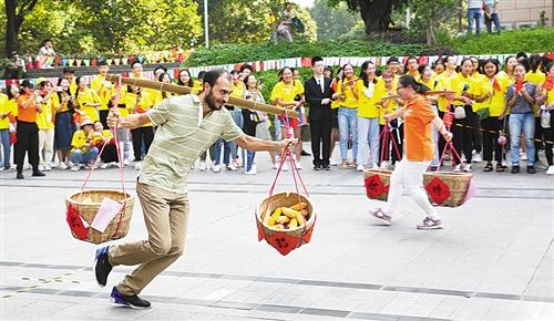 ▼重庆西南大学农学与生物科技学院的外国留学生与同学们一起庆丰收、迎国庆。秦廷富摄(中经视觉)