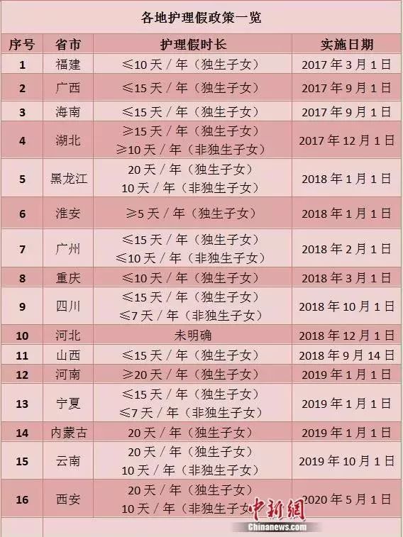 据不完全统计,截至目前,至少有包括福建、广西、海南、湖北、黑龙江、淮安、广州、重庆、四川、河北、山西、河南、宁夏、内蒙古、云南、西安在内的16地出台了“独生子女护理假”相关的具体规定。