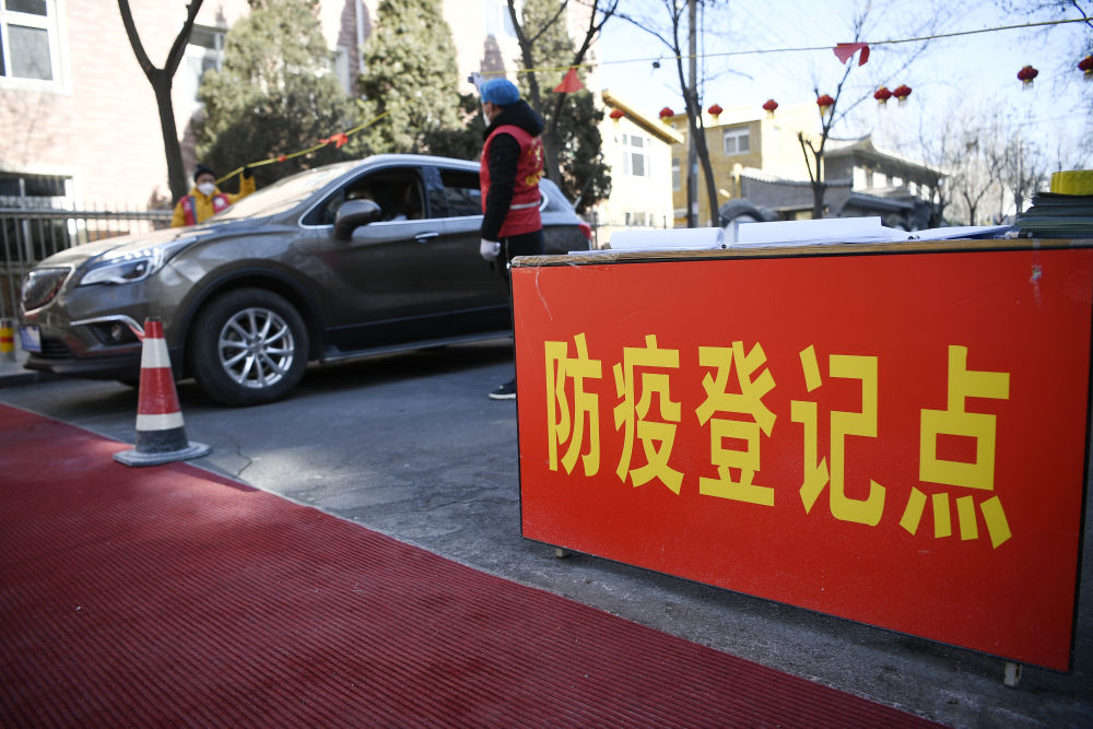 2月2日,宁夏银川金凤区北京中路街道锦绣苑社区,工作人员在唯一出入口对出入车辆进行登记、消毒。新华社记者 王鹏 摄