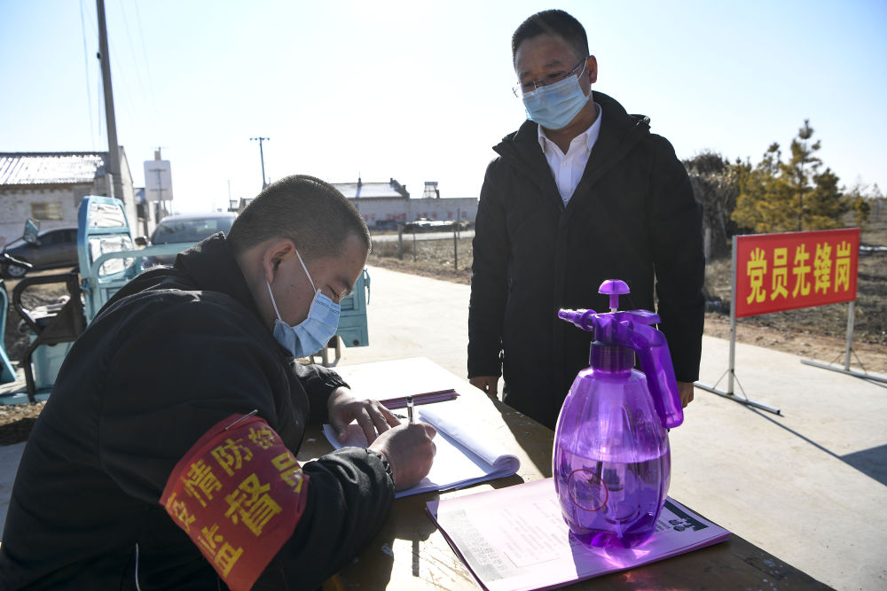 1月30日,宁夏吴忠市政务服务中心派驻盐池县王乐井乡官滩村的第一书记鲁国庆(左)对入村人员进行排查登记。新华社记者 冯开华 摄