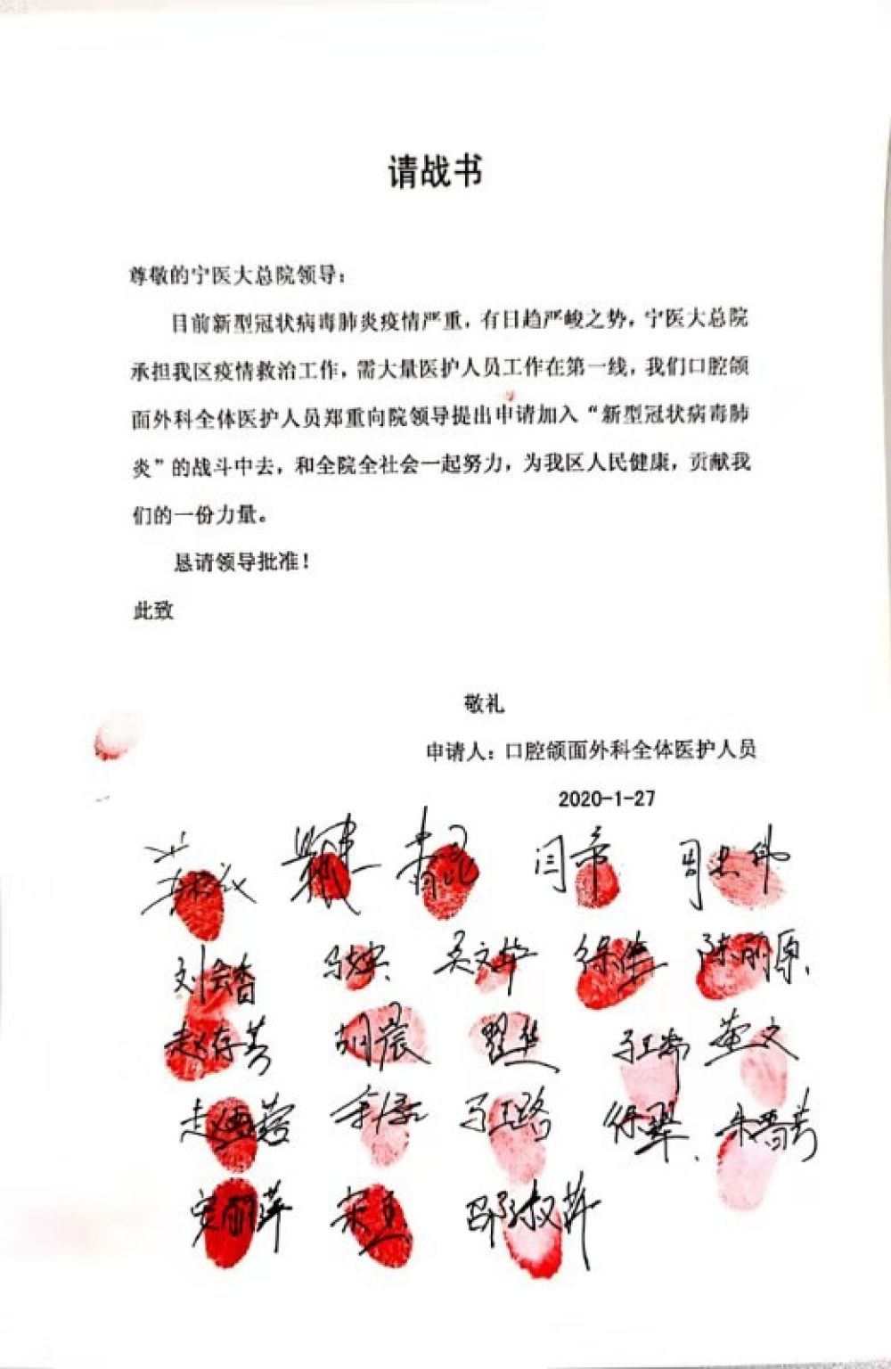 1月27日下午,宁夏医科大学总医院呼吸与危重症医学科的主任医师李秀忠和科室其他同事,在一封赴抗“疫”前线的“请战书”上,郑重署上姓名,摁下红手印。宁夏医科大学总医院第一批援鄂医疗队20名队员中,有党员12名。李秀忠身患糖尿病已有10余年,上有八旬父母、下有两岁小儿。