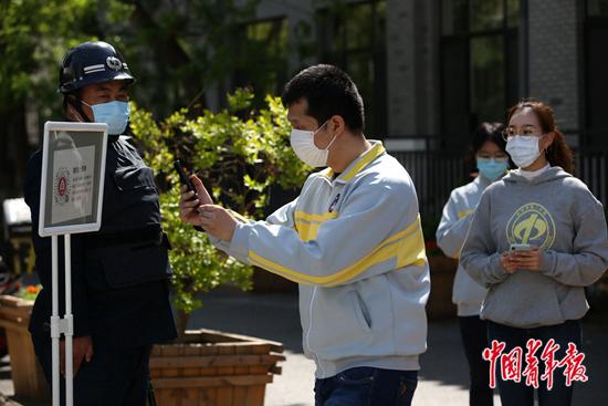 4月20日,北京二中,该校教师周一扮成学生在校门扫码查询本人健康状态。当日,该校举行高三毕业年级开学工作演练。