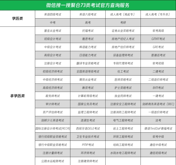除四六级成绩查询外,微信搜一搜还上线了考研、中高考、成人高考等7个学历考试和教师资格证、护士资格考试、托福、雅思等66个非学历考试的官方查询,聚合了考生关心的考试时间、报名入口、考点信息、在线备考课程及考后查询等多种服务。
