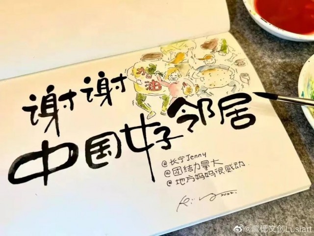 很快,简美霜创作了一副手绘:一位大叔抱来了大大的土豆,一位阿姨手里揽着一只鸡,有人抱着加油瓶,还有人送来了一袋米……中间则写着几个字:谢谢中国好邻居。