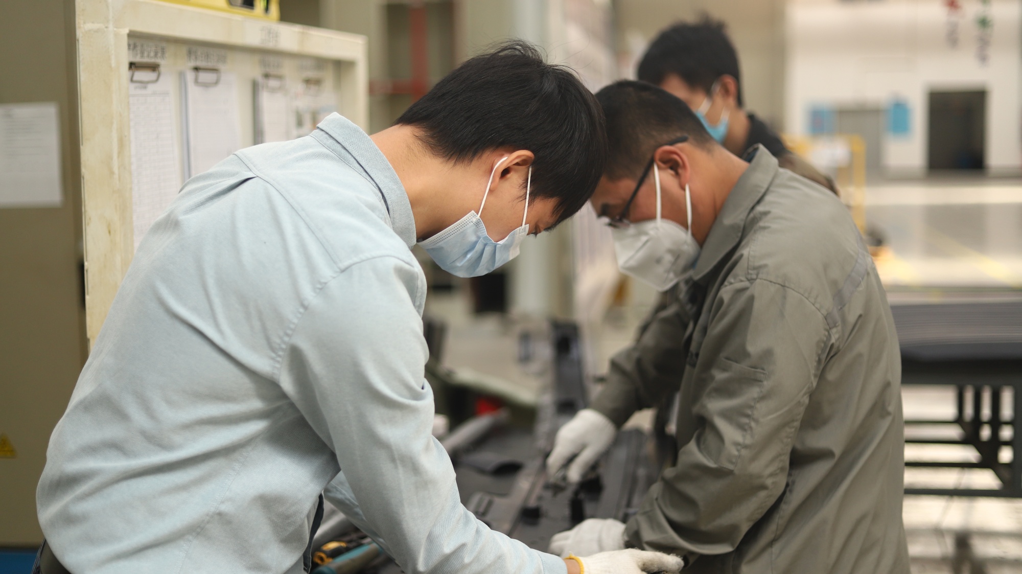工程师在智能化车间里有条不紊地“辅助”机器人工作(央广网实习生 杨宇航 摄)