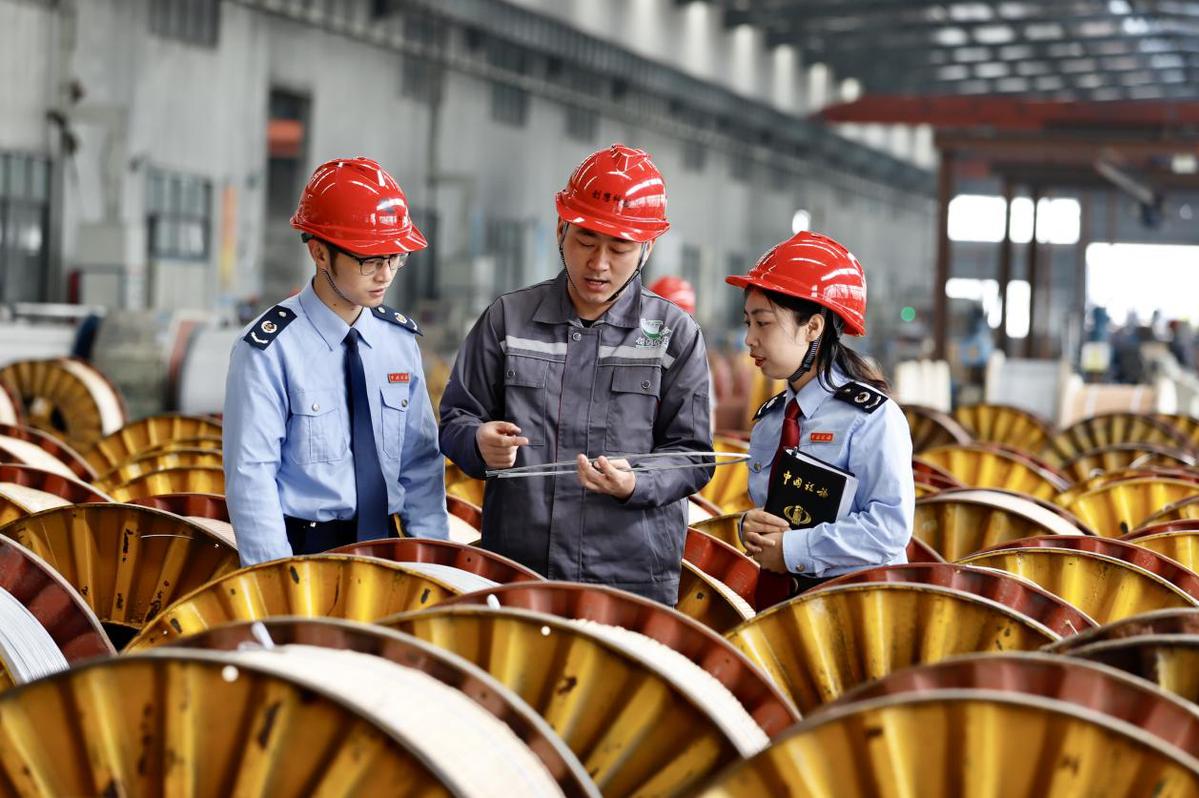 2023年5月10日,国家税务总局歙县税务局“燃税青年”志愿服务团队深入黄山创想科技股份有限公司车间,了解企业生产经营情况。(潘祯祥/摄)