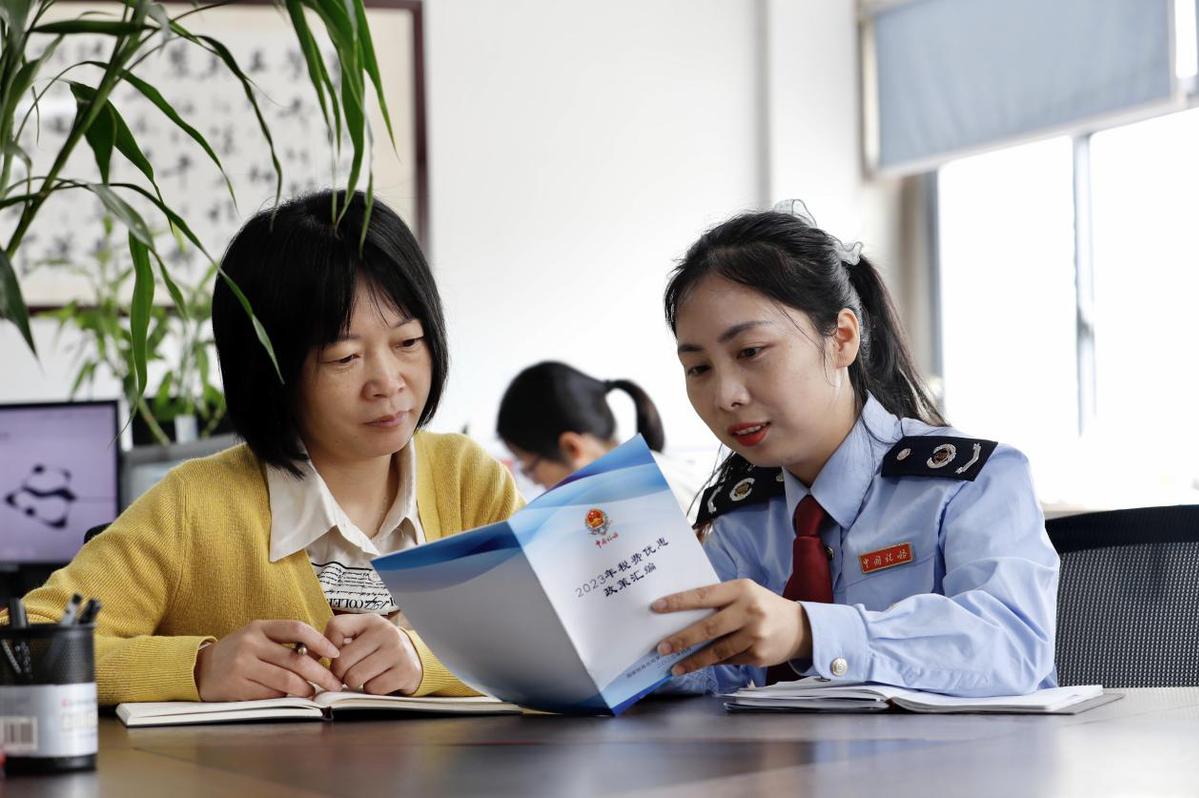 2023年5月10日,国家税务总局歙县税务局税务干部向黄山创想科技股份有限公司财务负责人宣传税务优惠政策。(潘祯祥/摄)