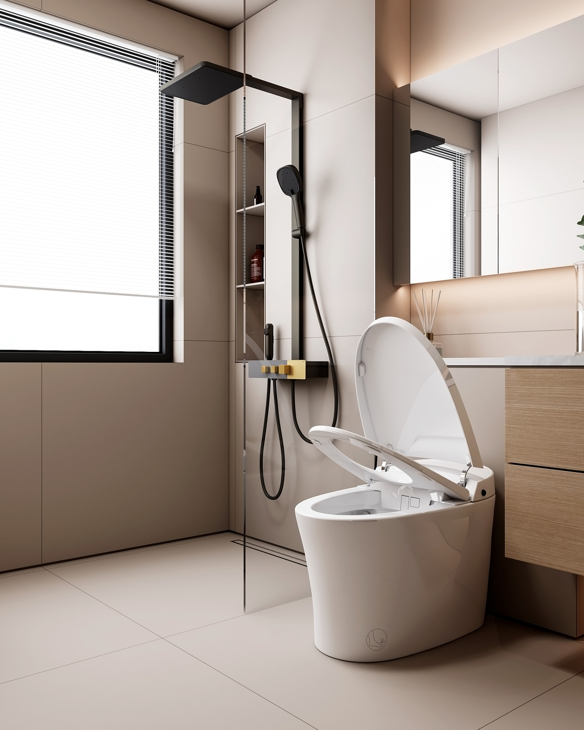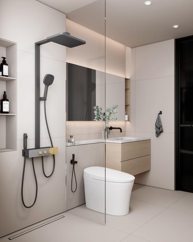 地面采用防滑砖,边缘圆角处理,避免磕碰;墙面预装隐形扶手,使用时轻轻下拉即可提供支撑;马桶侧边设置可折叠扶手,淋浴区配备升降花洒和淋浴凳,方便老人与行动不便者独立使用。所有开关、按钮均采用大尺寸触控设计,操作直观简单。这种“隐形适老”的设计思维,不仅体现了科技的温度,也让卫浴空间成为真正意义上的“全龄友好”空间。