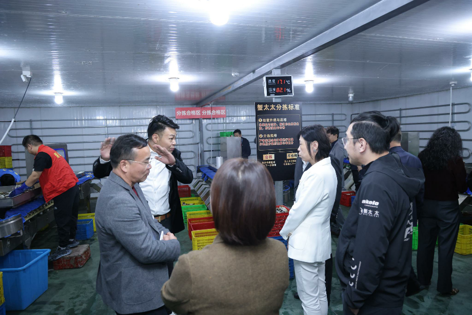 “高品质源于对源头的严格把控。”在产品包装车间,大家见证了一场“细节之战”:工人以标准化操作分拣封装,确保每只大闸蟹符合严苛品质要求。这份底气来自企业与优质养殖基地的长期合作——通过科学养殖方法优化环境、调配饲料,从源头保障大闸蟹的口感与营养。