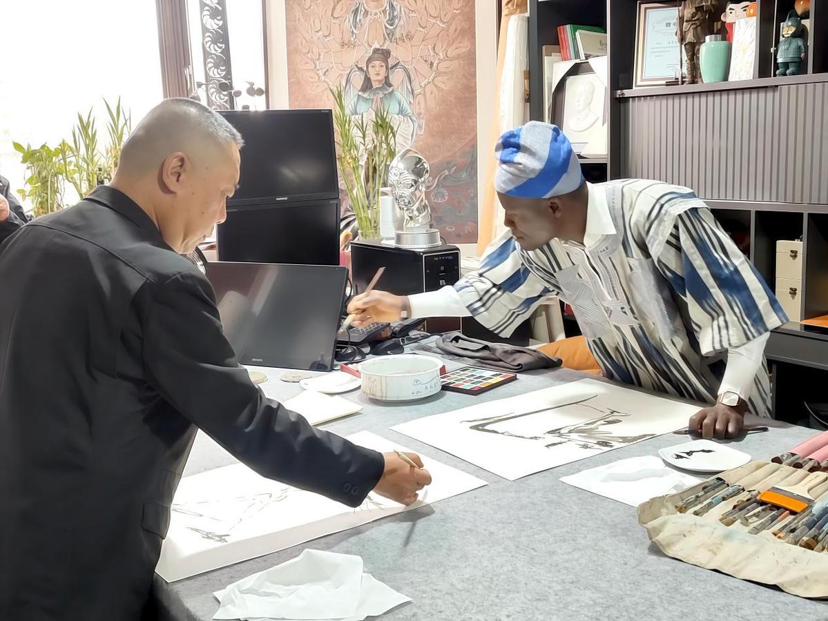 随着一系列精彩活动在贝宁的成功举办,两地的情感纽带也愈发牢固。10月9日至15日,贝宁艺术家TOSSOU ELON-M CATILINA AMEVI与SOSSOUVI REMI AMA访问西安。两位艺术家与西安中国画院开展专业交流,在王犇院长的陪同下参观了画院展厅与画家工作室,了解了画院发展历程,并围绕两地艺术发展与创作理念展开座谈。随后双方以笔会友,联合创作,完成了一场内容丰富、互动深入的艺术对话。贝宁艺术家们还深入西安历史文化遗址及特色人文场景实地考察创作,在古城西安留下了独特的艺术印记。