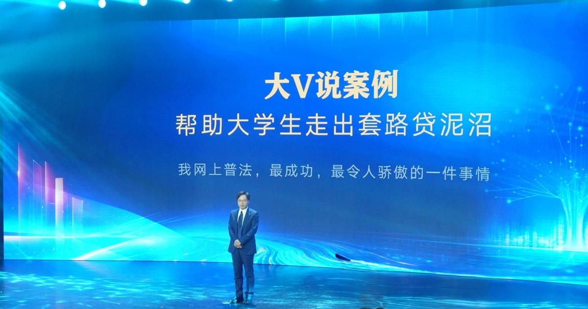 在“大V说案例”环节,千万粉丝法律大V庞九林以《帮助大学生走出套路贷泥沼》为主题,讲述其参与网络普法的真实经历,引发现场强烈共鸣。